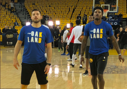 根據(jù)The Athletic記者Sam Amick報道,勇士在本場比賽前,特別訂做了印有“為了奧克蘭”字樣的球員熱身T-恤衫和毛巾(見新聞配圖),并為了支持此前受傷的球隊(duì)前鋒凱文-杜蘭特,特意將KD兩個字母印在最后,可以看作是“為了奧克蘭,為了KD”。